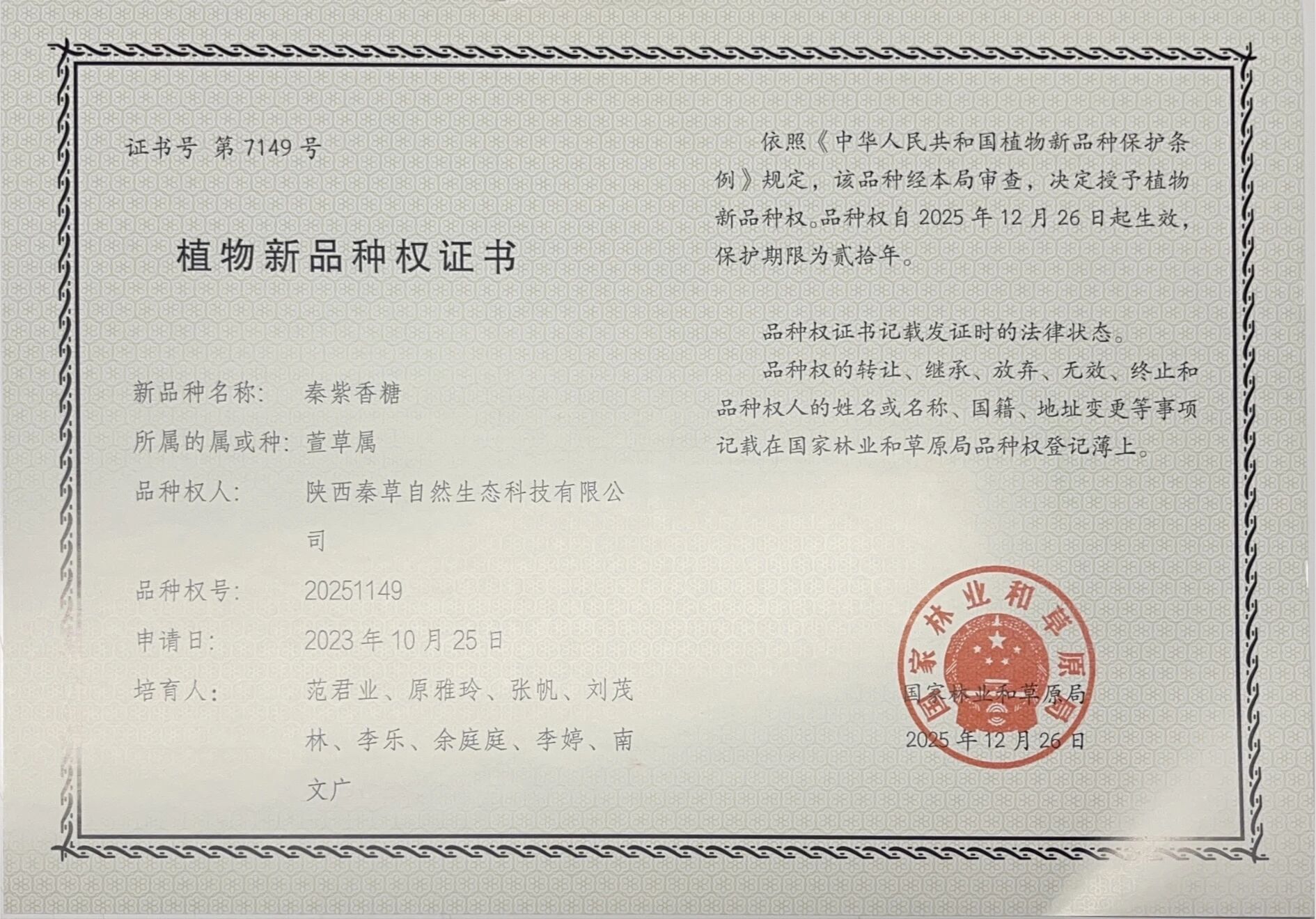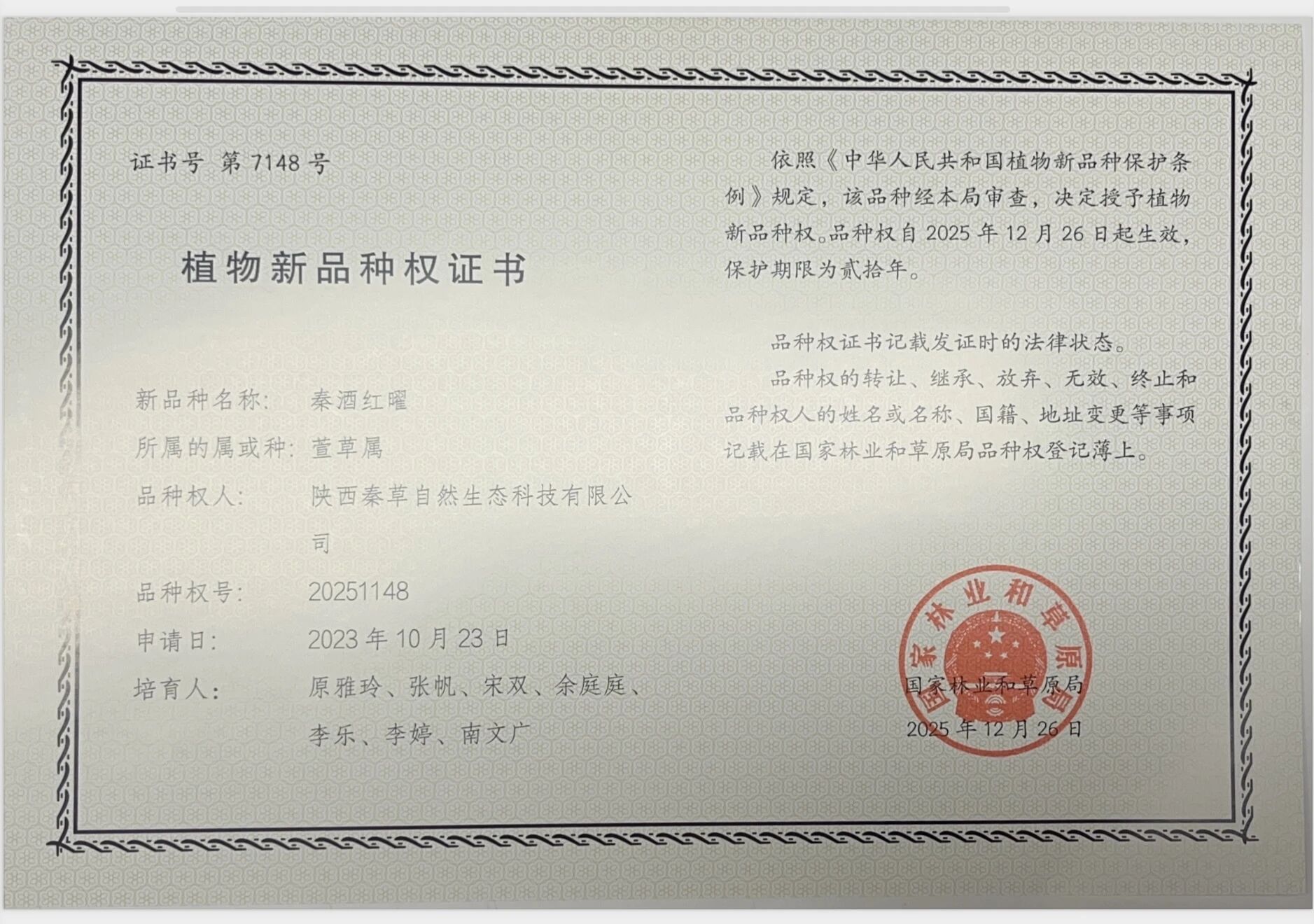 近日,陕西秦草生态培育的 “秦红一号”、“秦酒红曜”和“秦紫香糖” 三个植物新品种,成功荣获国家林业和草原局授予的植物新品种权证书(证书号第 7147、7148、7149 号),品种权自 2025 年 12 月 26 日起生效,保护期限 20 年。
