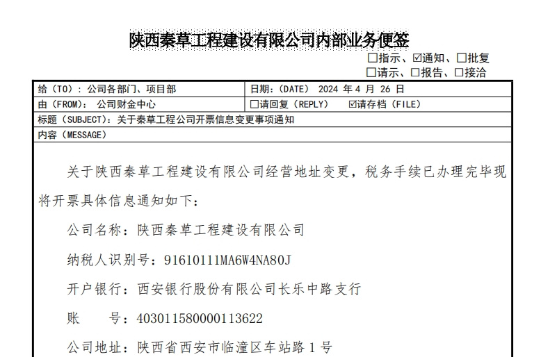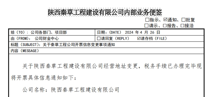 秦草-工程公司开票信息变更事项的通知24.4.26