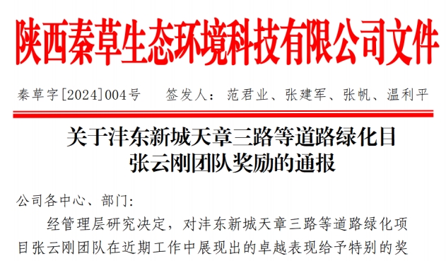 关于沣东新城天章三路等道路绿化项目张云刚团队的奖励通报