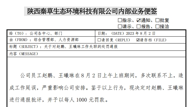 关于对赵鹏、王曦琳工作失职的处罚通报